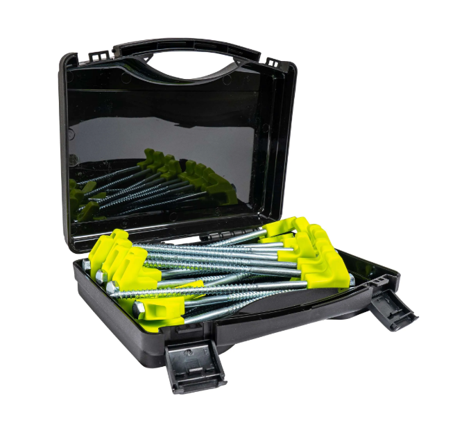De Bardani Rocky schroefharingset is geschikt voor verschillende harde ondergronden. Deze set bestaat uit een handige koffer met daarin 20 schroefharingen en een bijbehorende boorkop om de haringen te plaatsen. Dankzij de groene scheerlijnhaken aan de bovenkant vallen de haringen goed op.