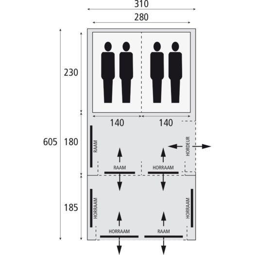 De oppomptent is voorzien van een royale luifel aan de voorzijde met een combiwand en wegrolbare zijdeuren inclusief horramen. De leefruimte van de tent heeft een zij-ingang en de deur is extra breed. De twee slaapcabines zijn extra groot met een lengte van 230 cm. Naast dit formaat zullen de donkere binnententen zorgen voor nog meer slaapcomfort.