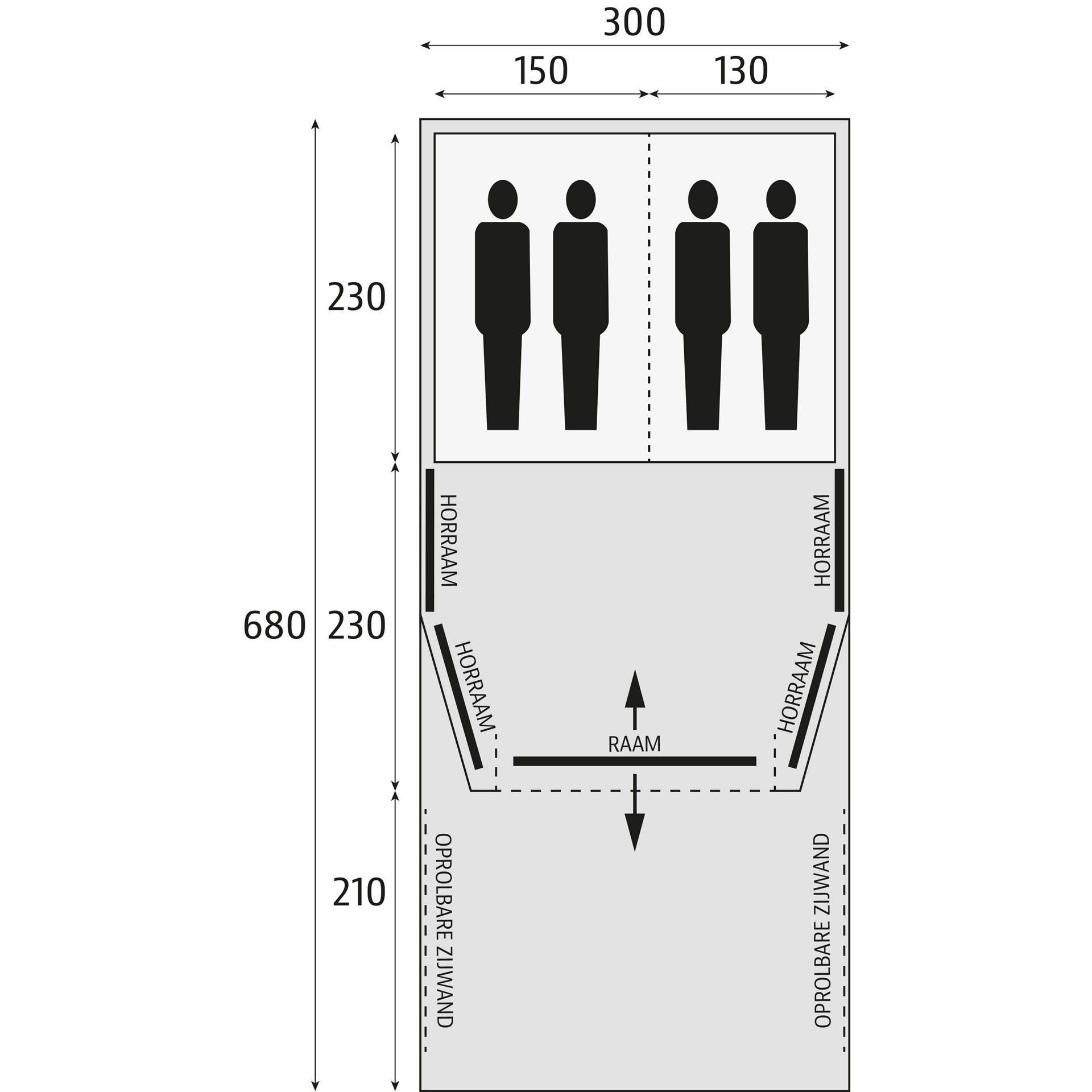 Naast de ruime leefruimte, beschikt deze Bardani familietent over 2 slaapcabines voor 2 personen. U kunt zelf de indeling van de tent aanpassen door de scheidingswanden weg te ritsen. De voorwand kunt u oprollen om de leefruimte nog verder te vergroten. Daarnaast zijn de slaapcabines extra lang (230 cm) en extra donker. De gordijnen zijn namelijk voorzien van een variosysteem, waarmee u aan de hand van ritsen de tent traploos kunt verduisteren.