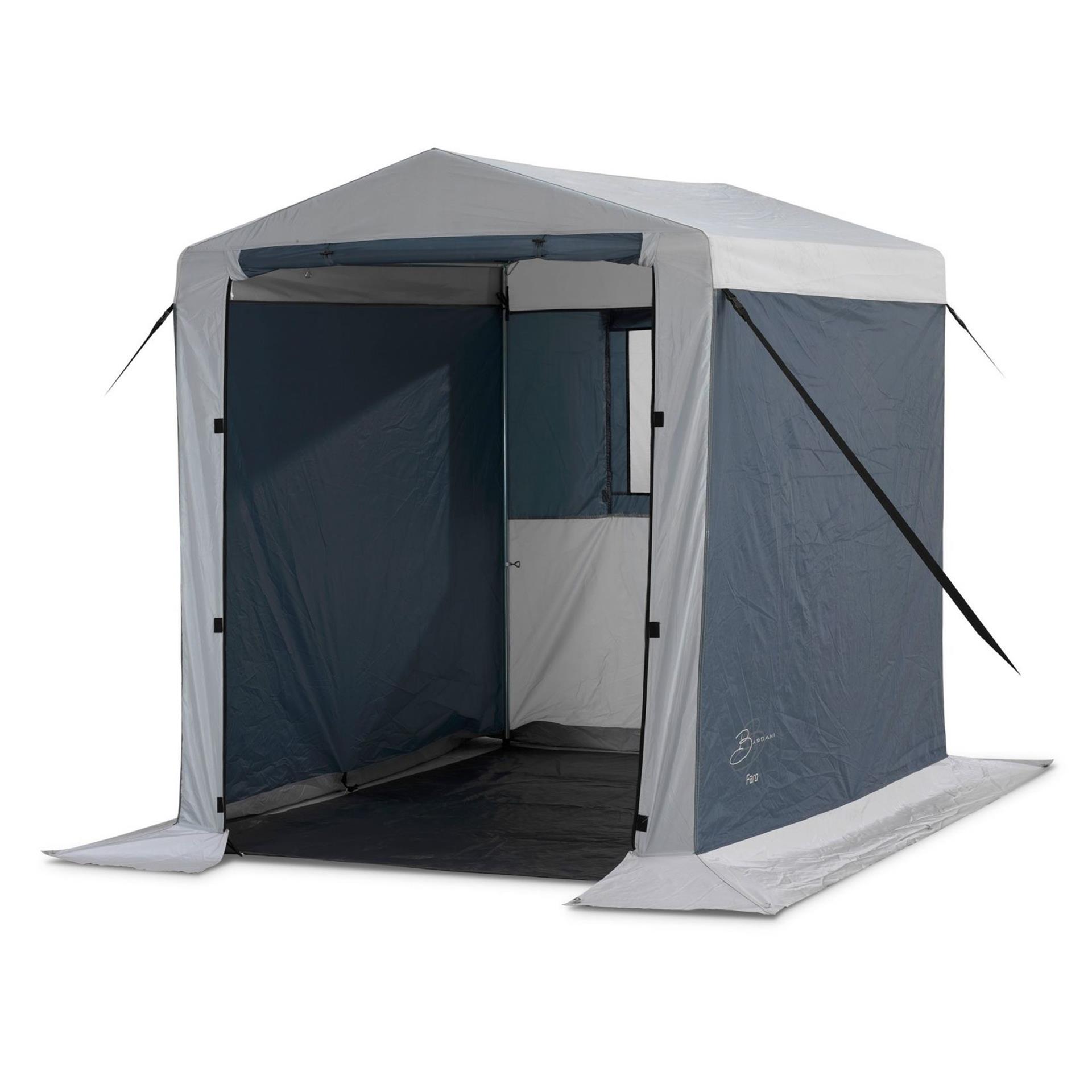 De Bardani Faro schuurtent biedt een maximale opbergruimte door het ontwerp met rechte wanden.De Faro schuurtent heeft een dak van 300D PVC gecoat polyester en wanden van 150D polyester met PU coating. De naden zijn getapet zodat ook daar geen lekkage kan plaatsvinden. De tent heeft een afsluitbaar horraam aan de achterzijde en is voorzien van nokventilatie. De tent wordt geleverd inclusief een PE grondzeil, haringen en scheerlijnen.