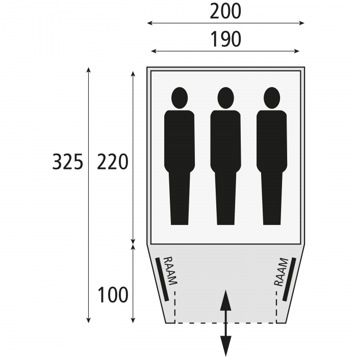 De slaapcabine meet 220 x 190 cm: comfortabel voor twee personen met bagage, of drie met compacte slaapmatten. In het midden is de tent 125 cm hoog, zodat u gemakkelijk kunt omkleden en ontspannen kunt zitten. Voor de ingang ligt een leefruimte van 100 x 200 cm; precies goed om als extra opbergruimte te gebruiken of om te koken. De totale tentmaat is 325 x 200 cm.