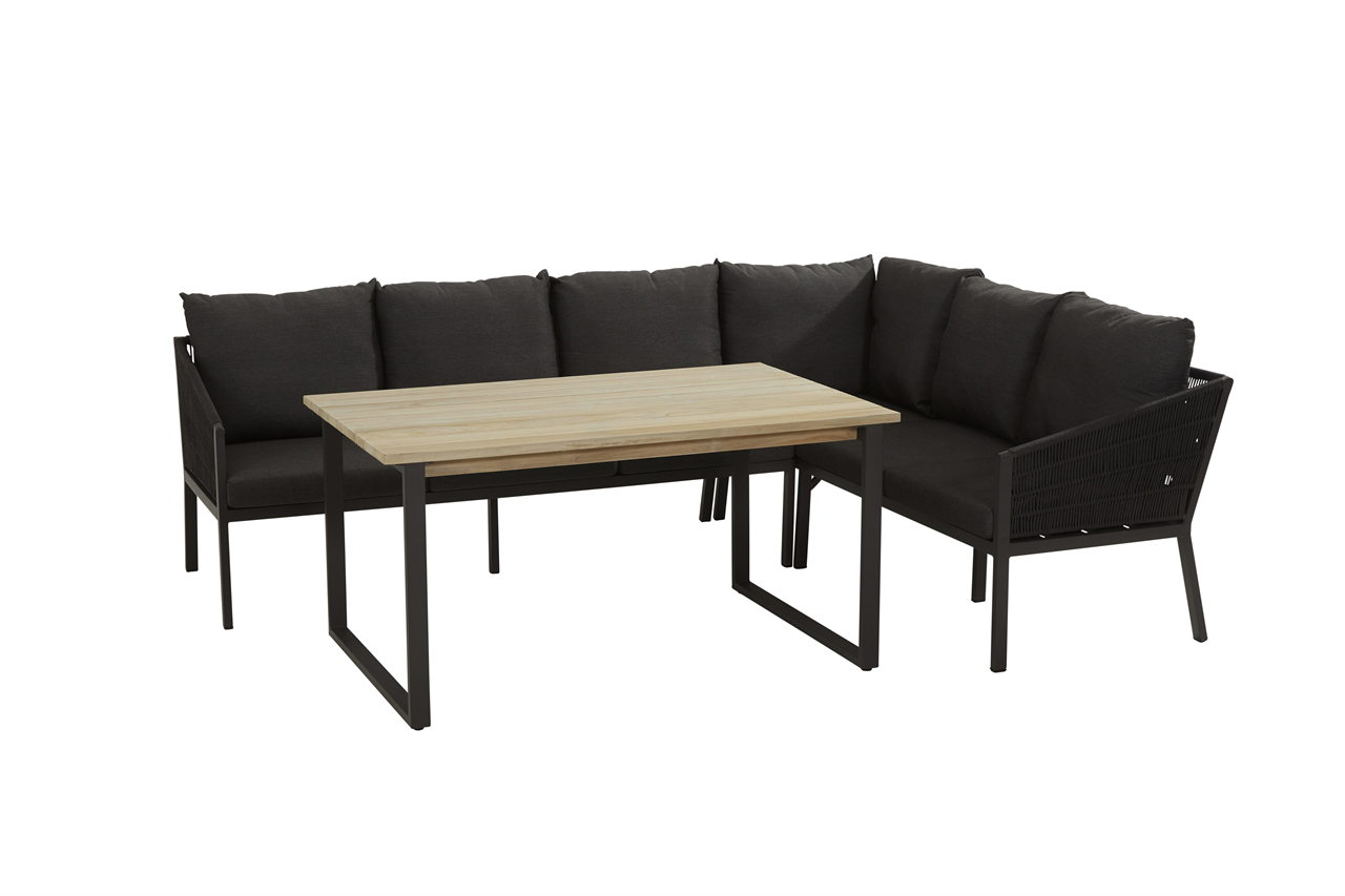 De TASTE by 4 Seasons Cruz 140 x 90 loungeset in de kleur antraciet teak is een combinatie tussen een loungeset en tuinset. De zithoogte van deze TASTE by 4 Seasons loungset is namelijk 45 centimeter hoog en de tafel heeft een hoogte van 72 centimeter. Hiermee is het ongeveer net zo hoog als een standaard tuinset, maar dan toch met de luxe uitstraling van een loungeset. De complete set heeft een roestvrij en licht aluminium frame, de tafel heeft een onderhoudsarm teakhouten blad en de kussens zijn gemaakt met een weerbestendige Olefin hoes. Hierdoor is de complete loungeset weerbestendig en kunt u deze met een beetje onderhoud het gehele jaar buiten laten staan.