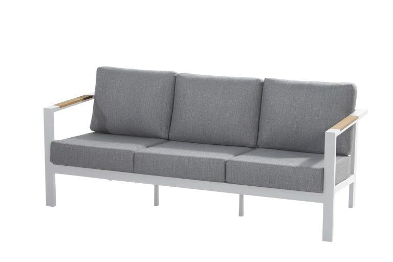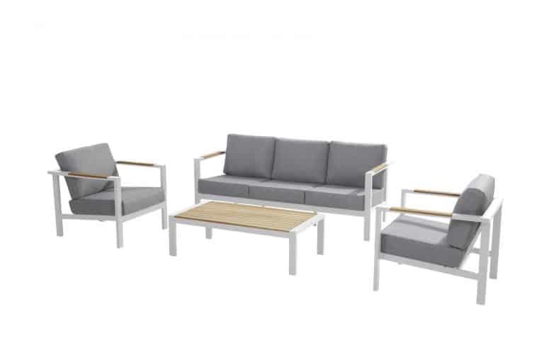 De Ginger loungeset bestaat uit een royale 3-zits bank, twee heerlijke ontspannen fauteuils en een bijhorende salontafel. Verder is deze loungeset nog te complementeren met een bijpassende voetenbank. Door de losse opstelling is deze loungeset vrijwel op ieder terras te plaatsen. De Ginger loungeset is vervaardigd van onderhoudsarm aluminium en teakhouten accenten. De Ginger loungeset is verkrijgbaar in twee kleuren: antraciet en wit. Beide kleuren contrasteren zeer fraai met het warme teakhout.
