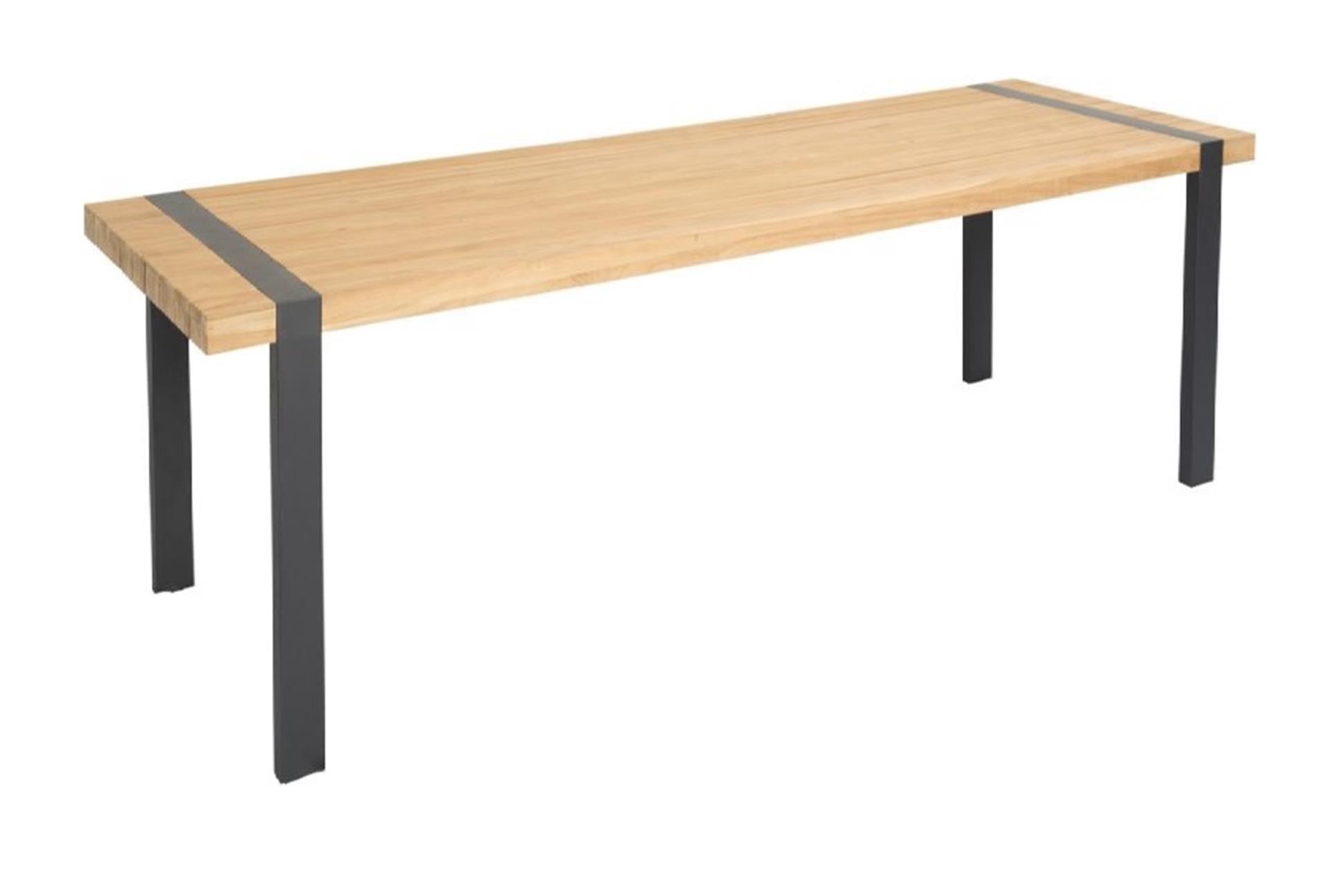 Deze stoere tuintafel is gemaakt van teakhout in combinatie met aluminium. Teak is een duurzame houtsoort en zorgt voor jarenlang genot. Het robuuste onderstel geeft de tafel een stoere look. De zwarte coating zorgt voor een mooi contrast met het teakhouten blad. Het mooie van deze tafel is dat het aluminium doorloopt. Dit onderbreekt het teakhout waardoor het aluminium ook vanaf de bovenzijde te zien is.