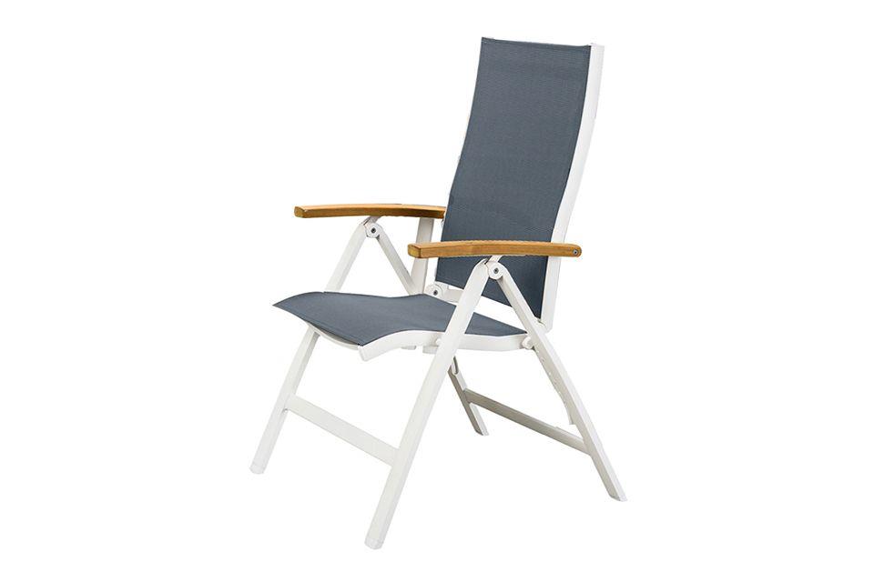 Door het aluminium met poedercoating, de textileen zitting en de teakhouten armleuningen is deze tuinstoel weerbestendig.