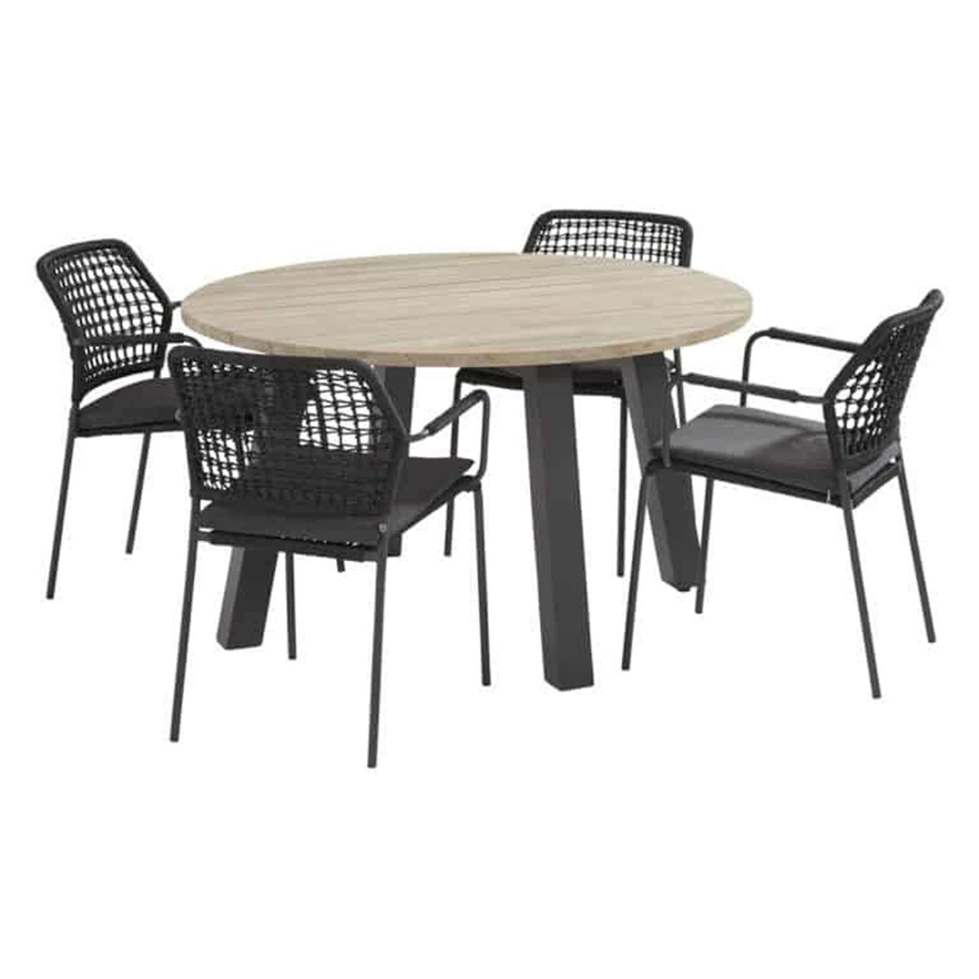 De Barista dining gecombineerd met de Derby tafel uit de collectie van Taste 4SO is een lust voor het oog! De verfijnde knoop techniek van het rope van de Barista stapelstoel, gecombineerd met de industriële looks van de Derby tuintafel is een zeer geslaagde combinatie. De Derby teak tafel 130 cm rond biedt ruimte voor ten minste 4 stoelen, waardoor u gezellig samen kunt genieten van het buitenleven.