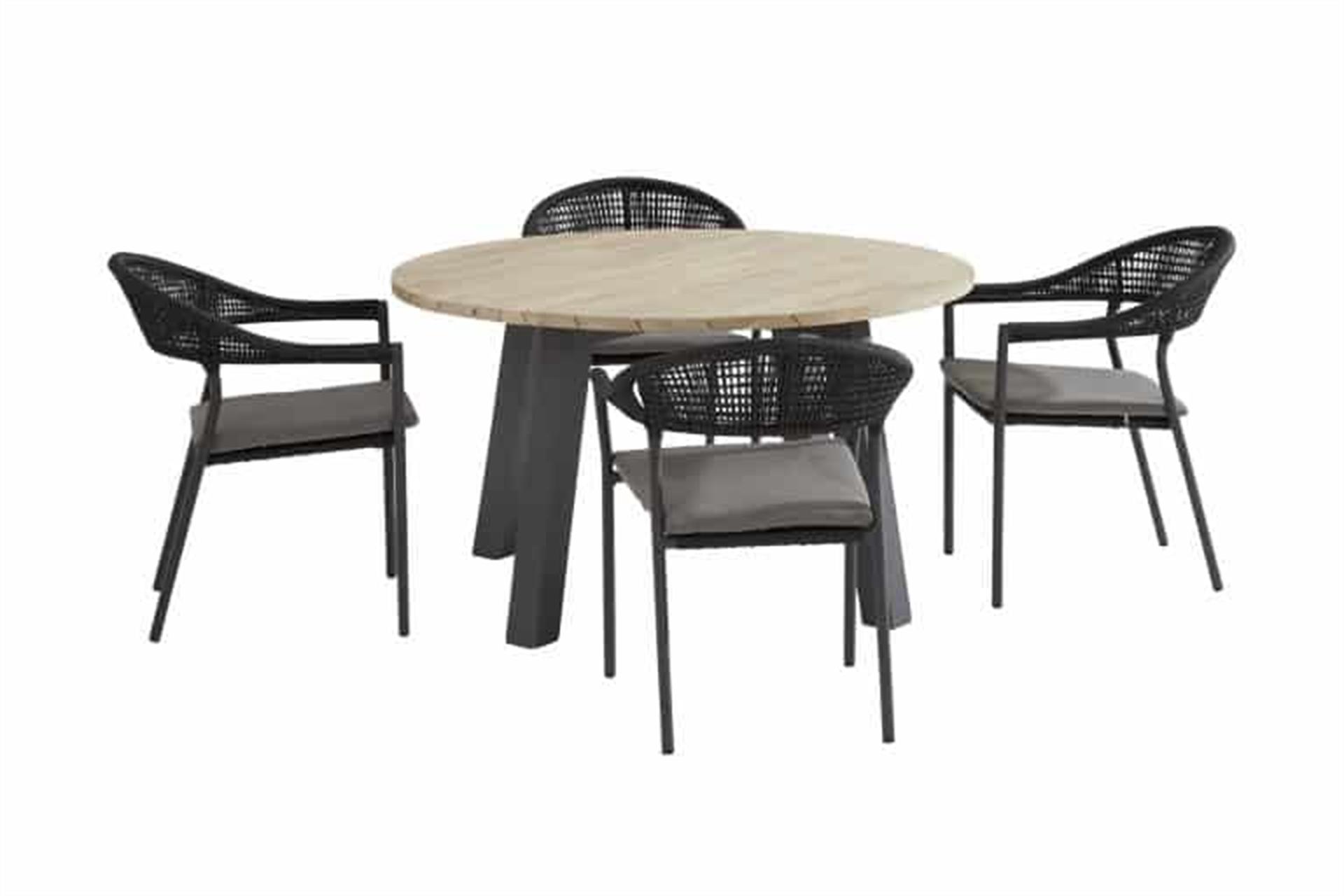 SIENNA-DERBY DINING SETMet de combinatie Sienna dining en de populaire Derby tuintafel in het rond geeft u uw terras een eigentijdse look. De rondingen van de Sienna tuinstoel sluiten perfect aan bij de Derby tuintafel van 130 cm rond. De eigentijdse materialen rope, aluminium en grey wash teak hout, zijn ook nog eens gemakkelijk in het onderhoud. De meubelen van Taste 4SO zijn geschikt om altijd buiten te laten staan, maar de Sienna is eventueel compact op te stapelen indien gewenst.