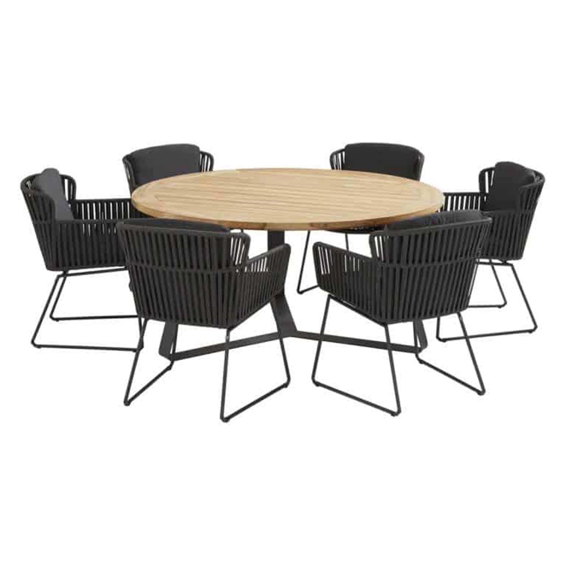De moderne Vitali dining, welke leverbaar is in twee kleuren, laat zich fantastisch combineren met de Basso tafels van Taste 4SO. De Basso teak tafel van 160 cm rond biedt ruimte voor zes stoelen. De Basso tafel heeft een robuust gepoedercoat stalen onderstel. Dit in combinatie met het naturel kleurig teakhouten blad zorgt voor een eigentijdse en warme uitstraling.