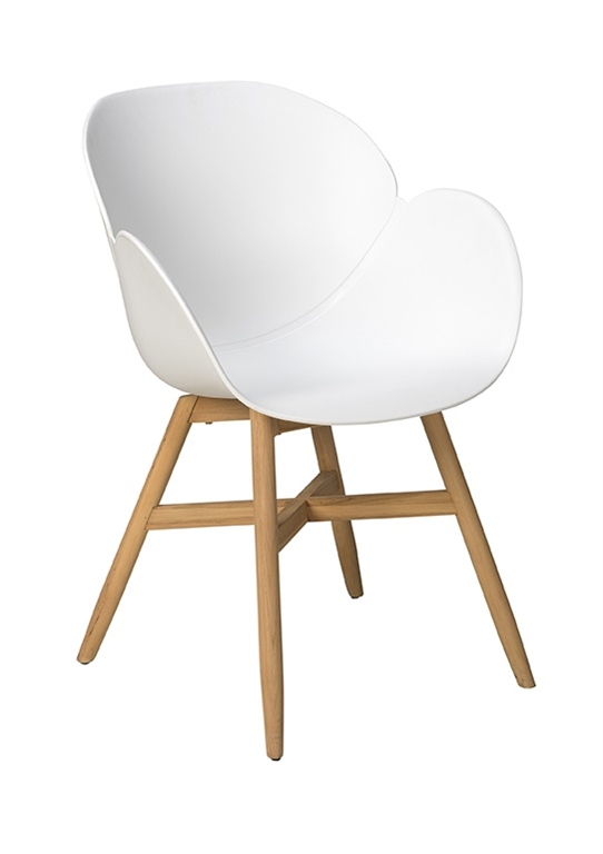 De combinatie van een kunststof kuip met een teak onderstel geef deze stoel een speels effect.