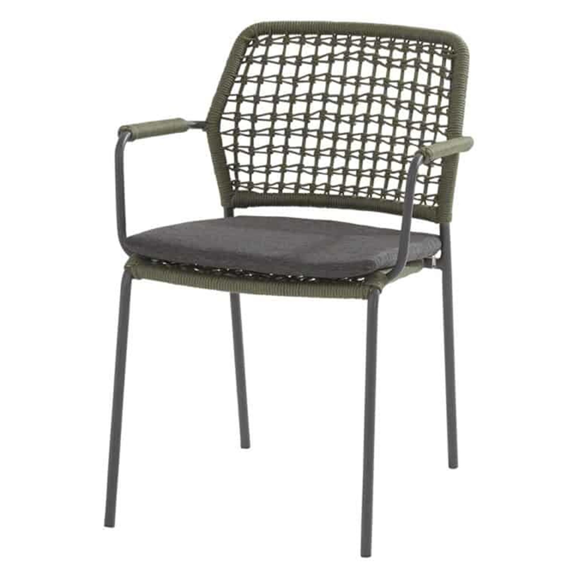 Deze stoel is er in 3 kleuren rope: antraciet, groen en blauw. Je kijkt hier naar de groene variant. Je kunt dus kiezen welke kleur het beste past op je terras, of je maakt een mooie combinatie van 2 of zelfs 3 kleuren. Het rope materiaal is weerbestendig en in een blok-patroon geknoopt. Het rope komt op subtiele wijze weer terug in de armleuningen.