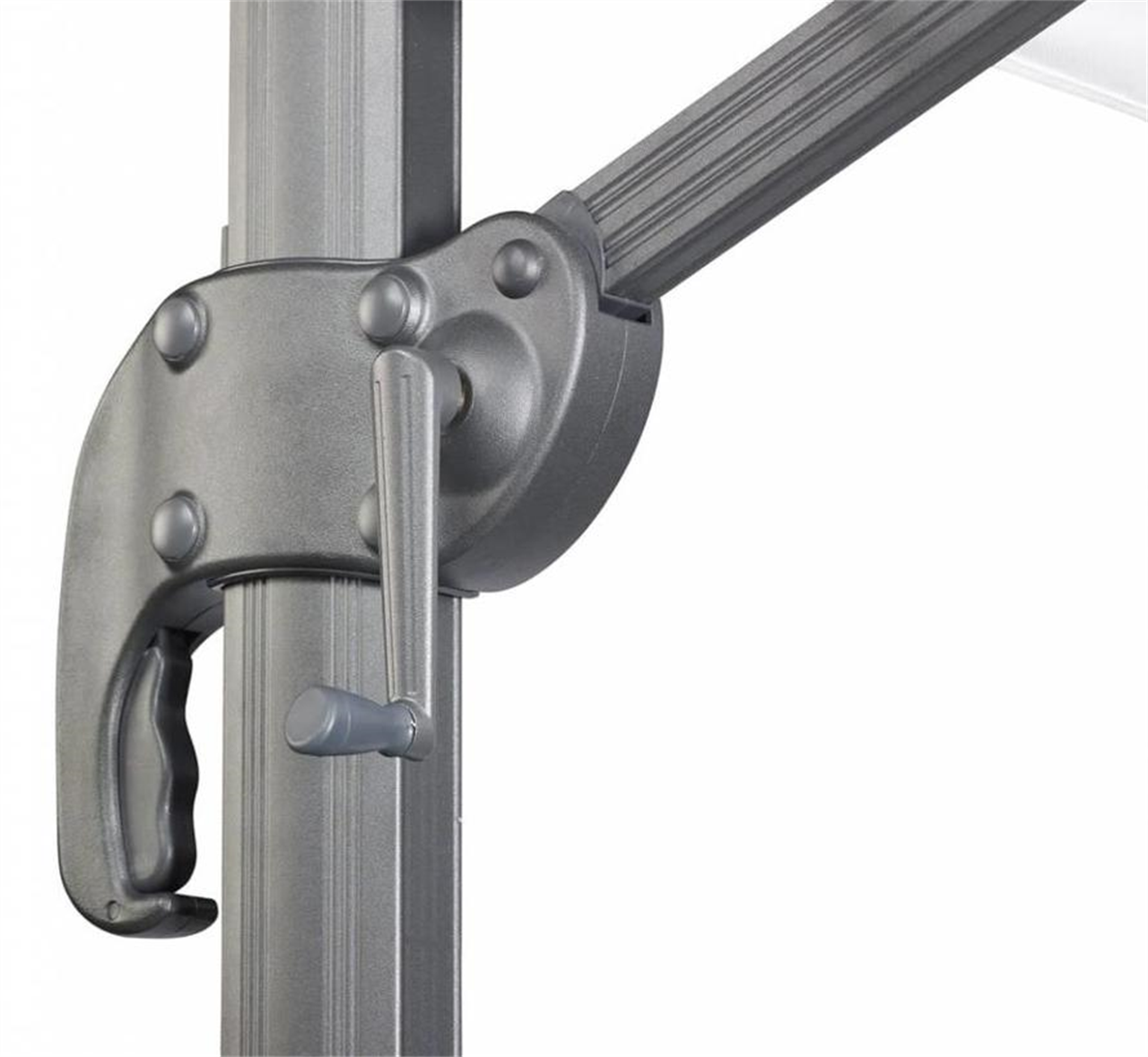 Uitvoering parasolDe Falcon T1Ø3.0 van Platinum is uitgevoerd met een kantelbaar systeem. Dit zorgt ervoor dat de parasol achterover kan kantelen. Ook is de Falcon parasol 360 graden draaibaar. U hoeft nooit meer veel moeite te doen om uit de zon te blijven op deze manier. Het design van de parasol is uniek. Er is goed nagedacht om de parasol niet zo nadrukkelijk aanwezig te laten zijn als deze is ingeklapt. Hij valt netjes langs de mast en neemt niet veel ruimte in beslag.